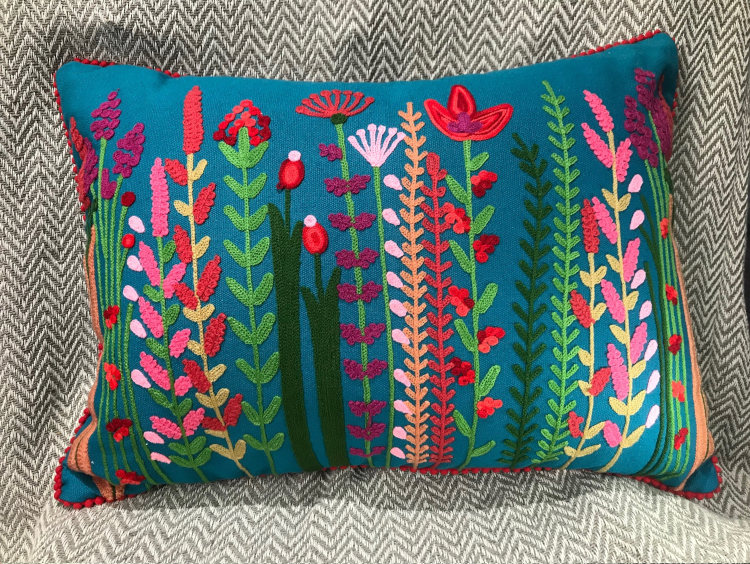 This beautiful cushion is decorated with a wild flower design in Indian embroidered needlework and edged with delicate trim. Full of depth and texture.