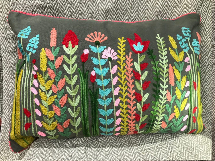 This beautiful cushion is decorated with a wild flower design in Indian embroidered needlework and edged with delicate trim. Full of depth and texture.