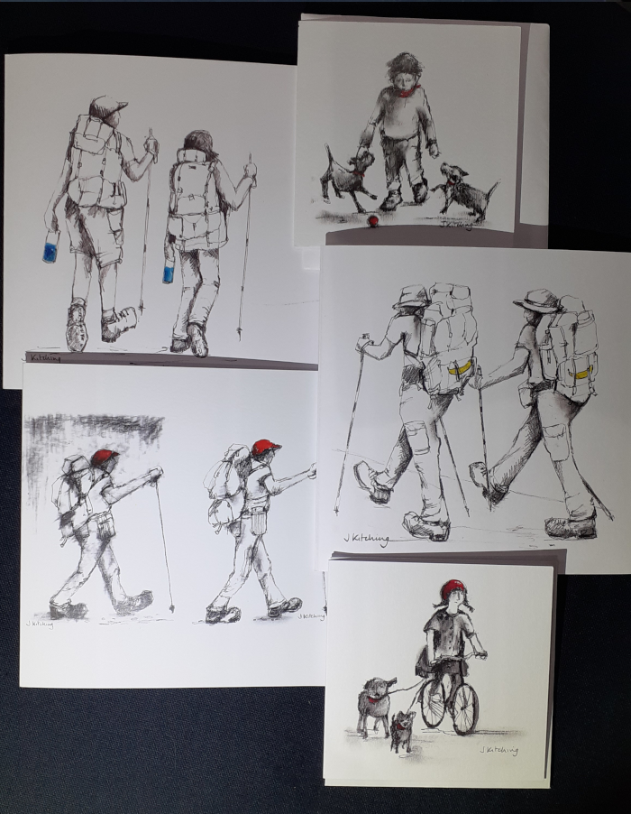 A set of 3 standard size cards and 2 small cards. The standard size cards were inspired by Jane’s experience of walking ‘Le Camino’, the smaller ones are fun and capture a small boy with two dogs and a small girl cycling with two dogs!