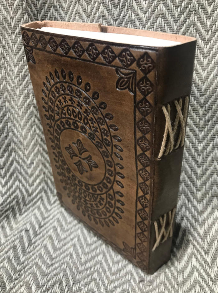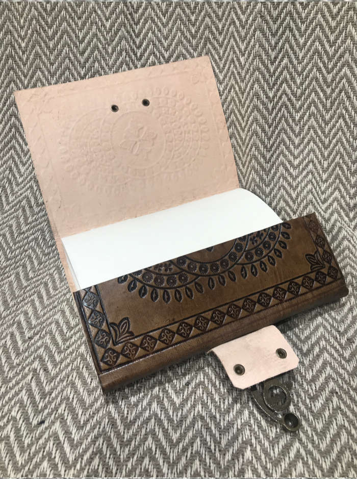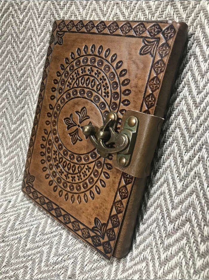 Hand-made Notebook with Leather Cover, closed with buckle. Beautiful decorations on the cover add charm. The product can be used as a notebook, diary or sketchbook. It is easy to carry, you can take it in your bag when you are travelling or on a business trip. It can be used as a diary, and record your ideas any time. Perfect gift for any occasion, it will pleased everyone who likes to travel, write, or do sketching.